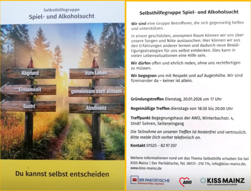seit 20.01.2026 trifft sich im Gruppenraum unseres AWO-Hauses mit Unterstützung der KISS Mainz | Der Paritätische, eine Selbsthilfegruppe „Spiel- und Alkoholsucht“. Die Gruppe bietet Betroffenen den geschützten und anonymen Raum, offen, ehrlich und ohne Rechtfertigung über Sorgen und Nöte zu sprechen und sich gegenseitig zu helfen und zu unterstützen. Ein weiteres Ziel ist es, aus den Erfahrungen anderer zu lernen und dadurch neue Bewältigungsstrategien für sich zu entdecken. Dies kann in vielen Lebenssituationen eine Hilfe sein. Die Gruppe legt großen Wert auf die respektvolle Begegnung auf Augenhöhe.