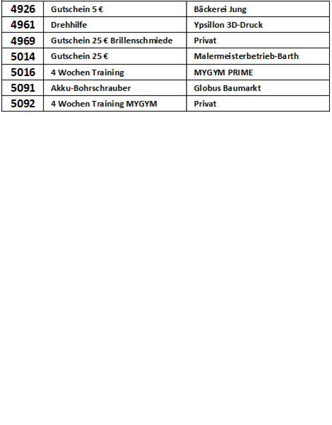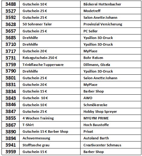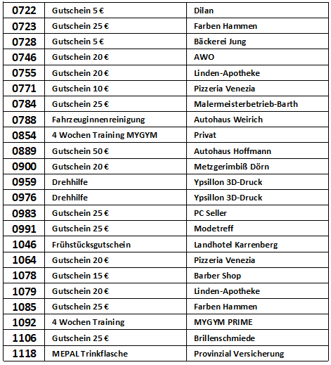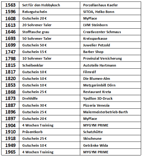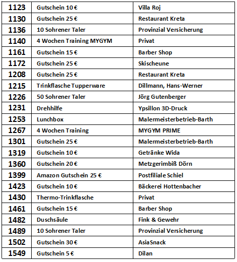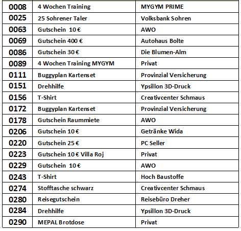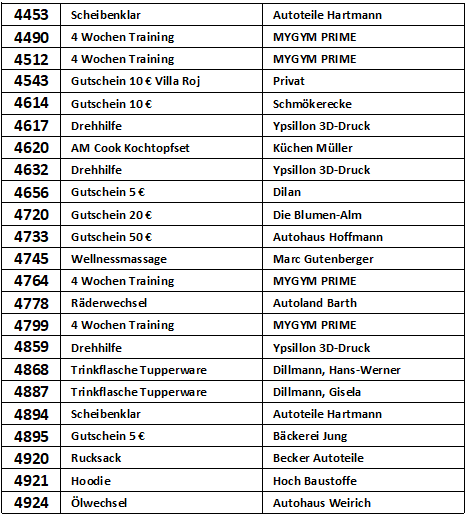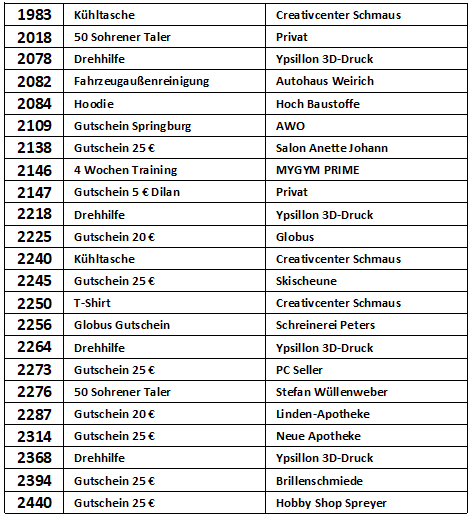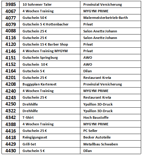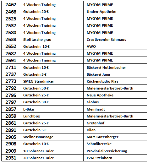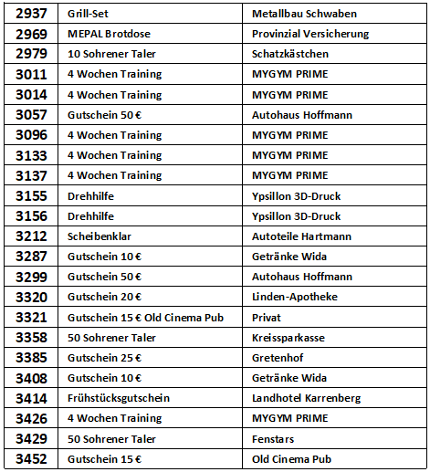 Vielen Dank, dass Sie an der Verlosung zur Michaeliskirmes in Sohren teilgenommen haben. In der nachfolgenden Liste können Sie nachschauen, ob Sie mit Ihrer Losnummer etwas gewonnen haben.